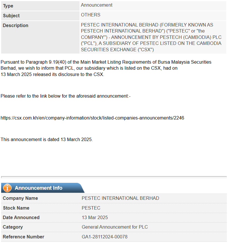 OTHERS PESTEC INTERNATIONAL BERHAD (FORMERLY KNOWN AS PESTECH INTERNATIONAL BERHAD") ("PESTEC" or "the COMPANY") - ANNOUNCEMENT BY PESTECH (CAMBODIA) PLC ("PCL"), A SUBSIDIARY OF PESTEC LISTED ON THE CAMBODIA SECURITIES EXCHANGE ("CSX")