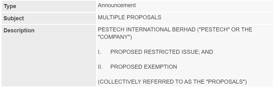 OTHERS PESTECH INTERNATIONAL BERHAD (“PIB” OR THE “COMPANY”) - PROPOSED SCHEME OF ARRANGEMENT PURSUANT TO SECTION 369C AND OTHER RELEVANT PROVISIONS OF THE COMPANIES ACT 2016 BETWEEN PESTECH INTERNATIONAL BERHAD AND ITS SCHEME CREDITORS (“PROPOSED SCHEME OF ARRANGEMENT)