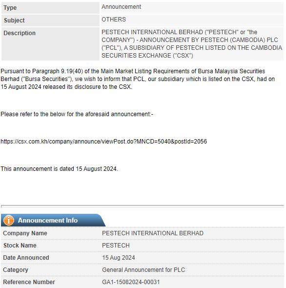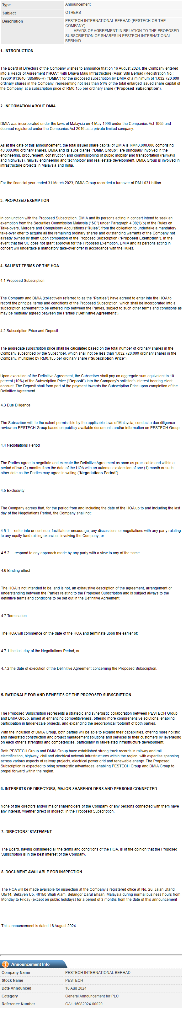 OTHERS PESTEC INTERNATIONAL BERHAD (FORMERLY KNOWN AS PESTECH INTERNATIONAL BERHAD) (the "Company" or "PESTEC") - NOTICE OF ARBITRATION SERVED BY SYARIKAT PEMBENAAN YEOH TIONG LAY SDN BHD ON PESTEC PURSUANT TO THE PARENT COMPANY GUARANTEE ISSUED ON BEHALF OF PESTECH TECHNOLOGY SDN BHD ("PTECH") - KUALA LUMPUR HIGH COURT CIVIL SUIT NO. WA-22C-84-12/2024 ("Suit 84") between PESTEC and PTECH against Syarikat Pembenaan Yeoh Tiong Lay Sdn Bhd