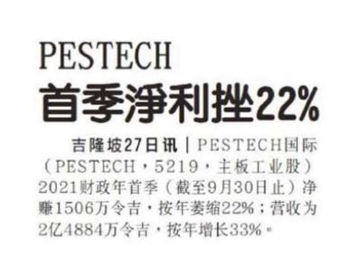 (吉隆坡27日讯)PESTECH国际(PESTECH,5219,主板工业股)2021财政年末季(截至6月30日止)净利按年飙涨137.72%,至2892万令吉;营业额也按年上涨15.59%,至2亿3193万令吉。